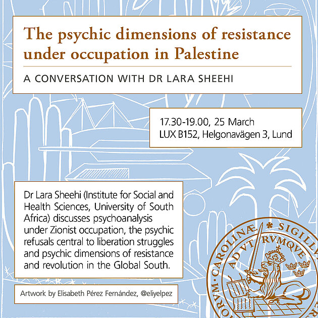 Lara Sheehi will discuss psychoanalysis under Zionist occupation, the psychic refusals central to liberation struggles and psychic dimensions of resistance and revolution in the Global South. It will be moderated by Heraclitos Muhire, Sociology of law, Lund university.